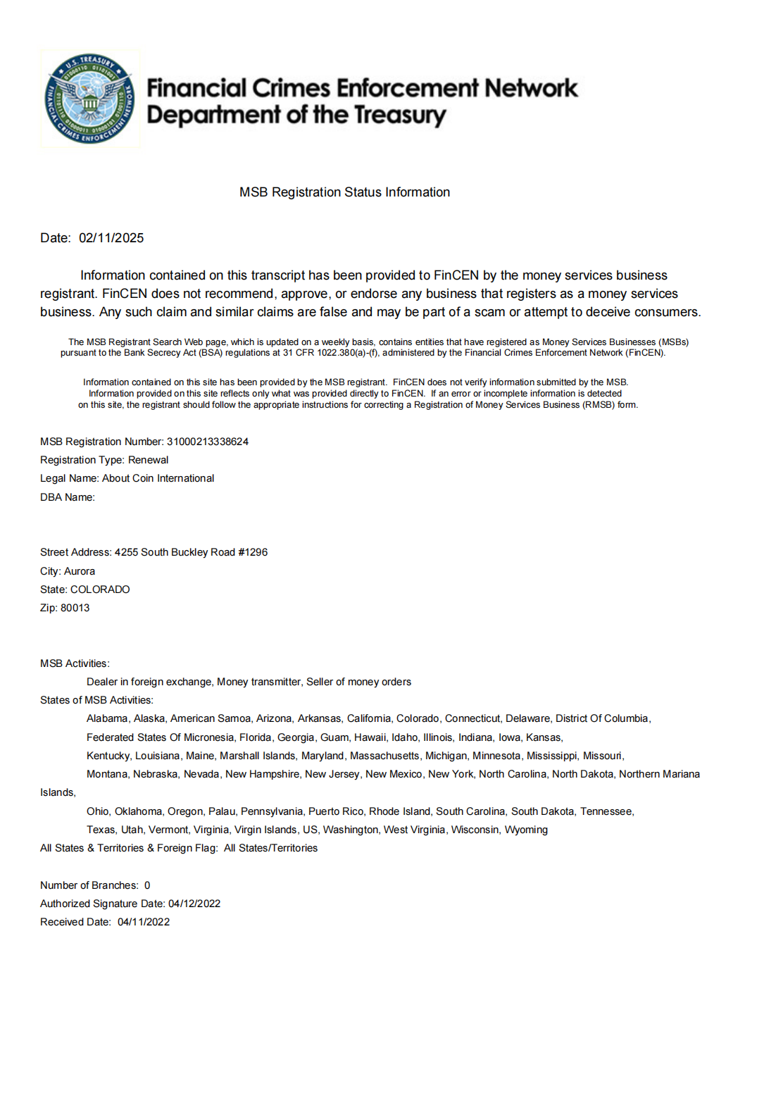 About Coin International has obtained the MSB (Money Services Business) license issued by the U.S. Treasury Department FinCEN, and is qualified to legally operate virtual currency trading services in the United States!