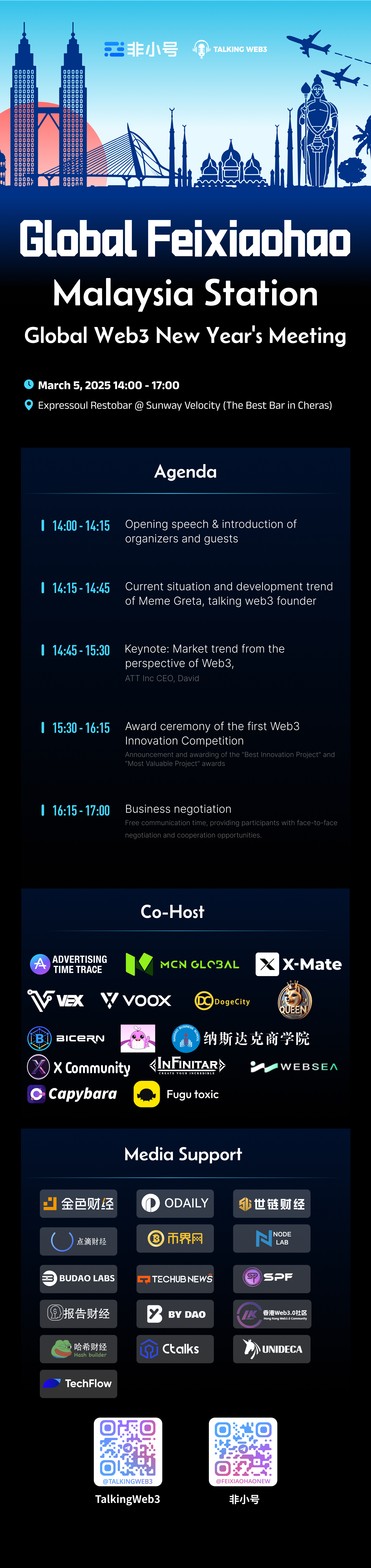 On March 5, 2025, the Feixiaohao Global Tour | 2025 Web3 New Year Meet-up will be grandly held at Sunway Velocity in Malaysia! The conference is jointly hosted by Feixiaohao, Talking Web3, and Nasdaq Business School, focusing on the global Web3 development trends. It will bring together industry leaders, top projects, investment institutions, and community representatives to explore the latest opportunities and challenges in trending sectors such as crypto derivatives, AI-driven crypto trading, RWA (real-world asset) digitalization, Meme economy, GameFi, and DeFi.