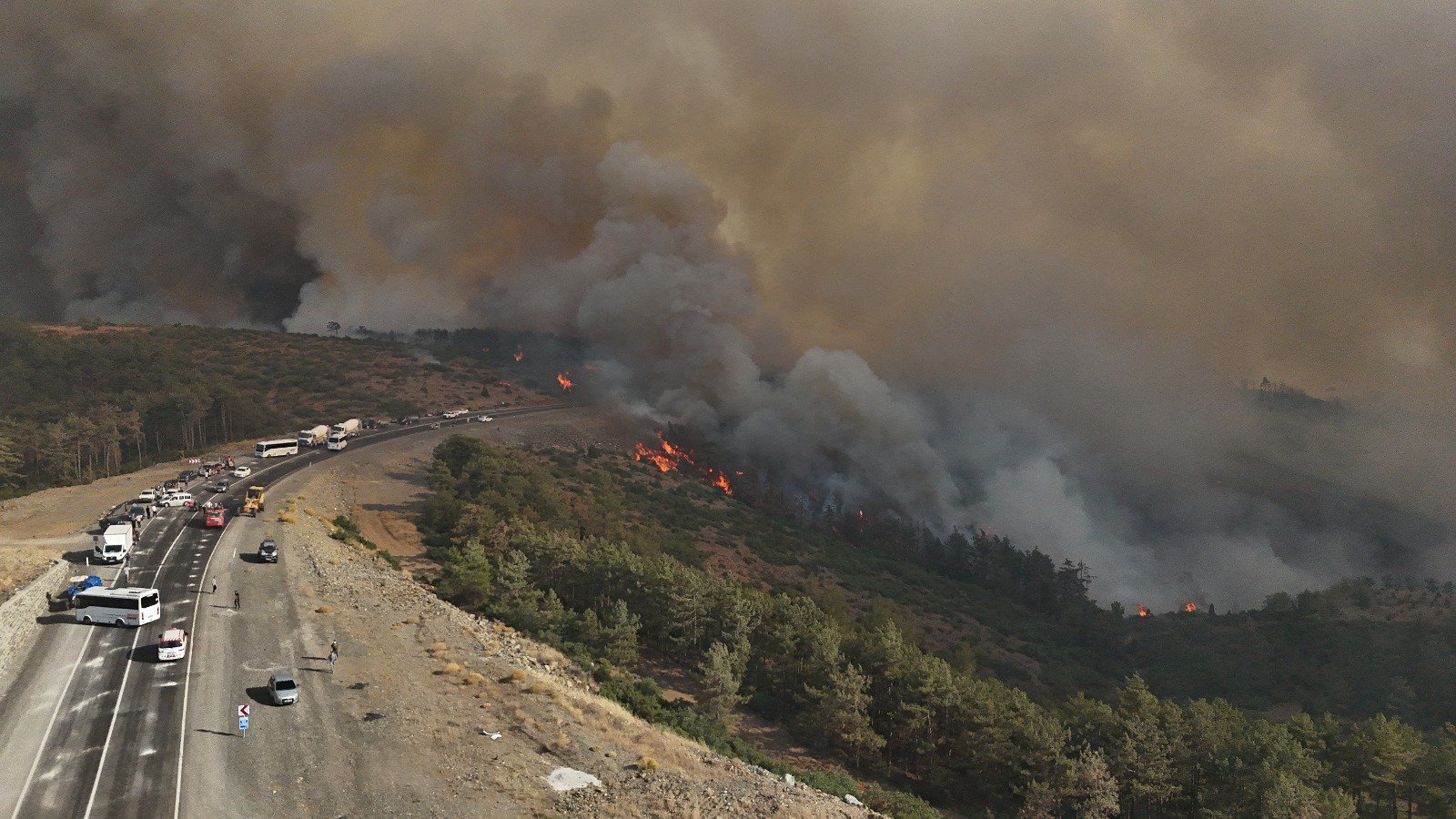 Flames and thick smoke rise from a forested area near the highway as firefighting teams respond to a wildfire in Bursa (Picture: Getty)