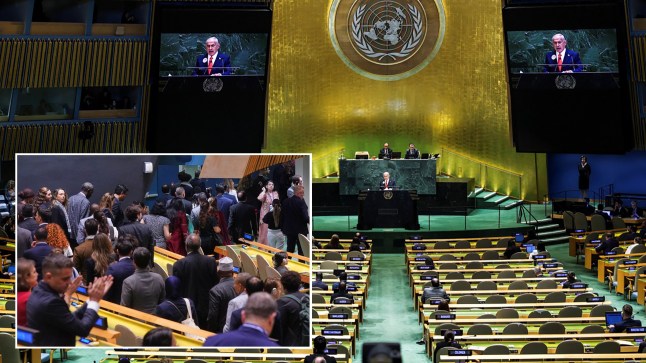 un delegates walk out ahead of netanyahu speech - the uk and us 'stayed put'